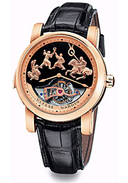 The hand carved figures on the black onyx dial are 18 ct. gold. The Tourbillon is visible and integrated into the watch face in a way that lends greatly to a piece that is already a work of art.